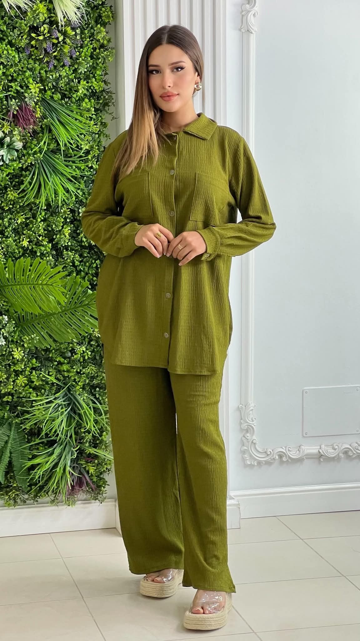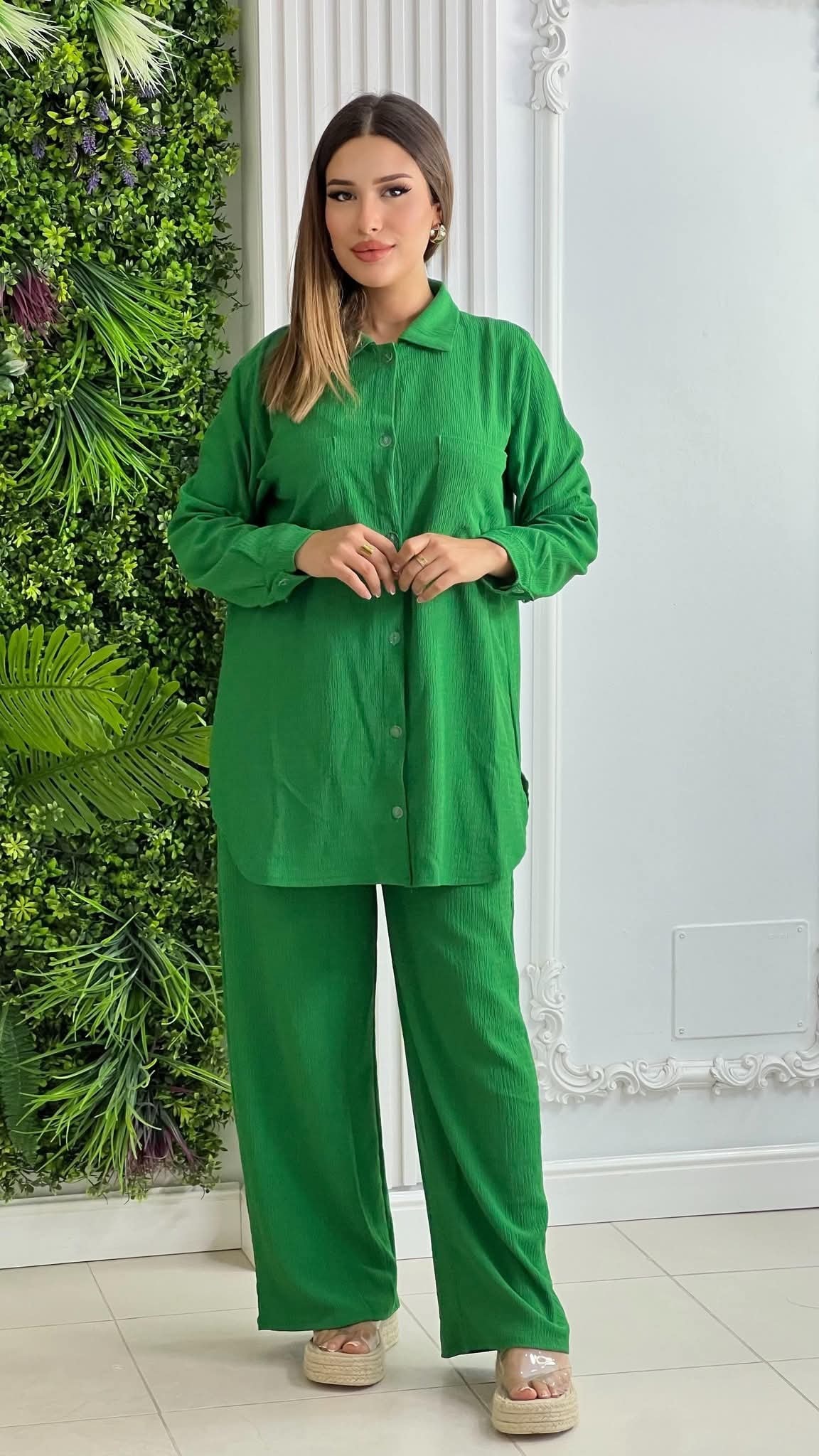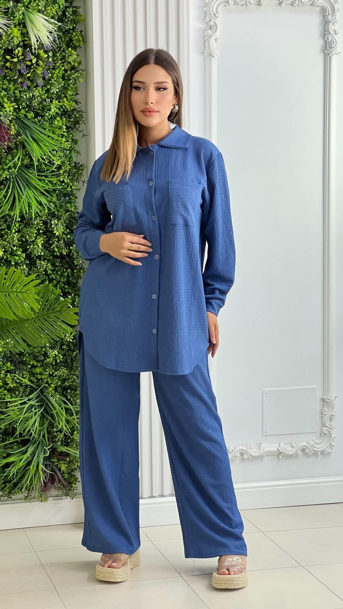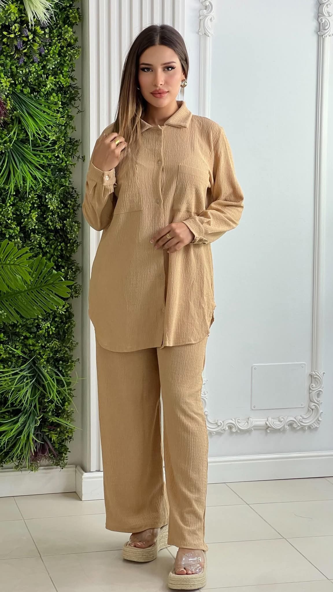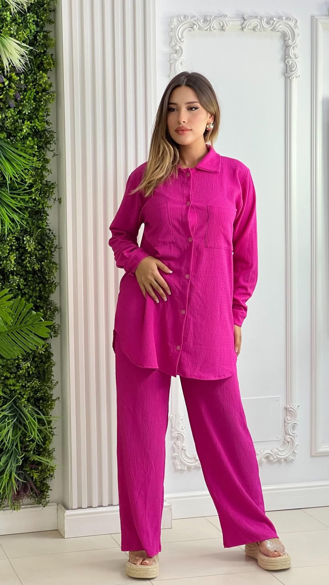 Un design moderne composé d’une chemise oversize boutonnée et d’un pantalon fluide, parfait pour un style à la fois élégant et décontracté.