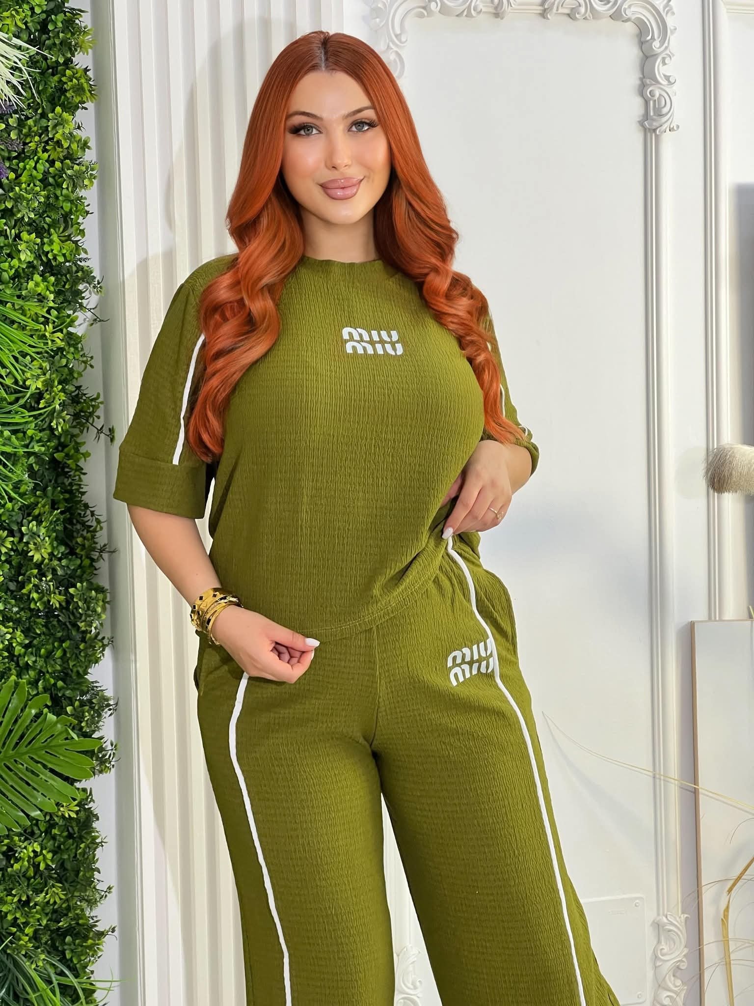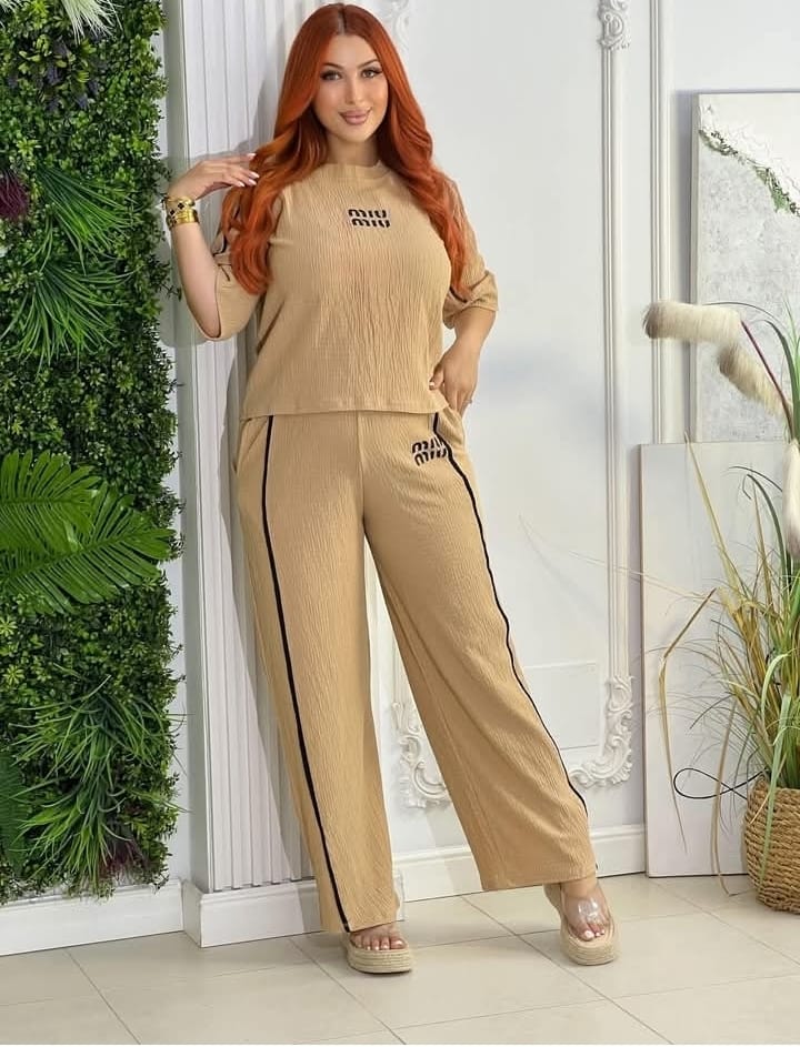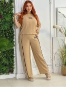 Adoptez cet ensemble beige tendance 🌟, composé d’un top oversize et d’un pantalon fluide à bandes latérales noires.